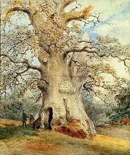 The Shelton Oak was pictured in Jacob George Strutt's 1822 book Sylva Britannica.[3] In 1823 it was recorded to be at least 41 feet 6 inches (12.65 m) high; 44 feet 3 inches (13.49 m) in circumference at ground level and 27 feet 4 inches (8.33 m) at a height of 8 feet (2.4 m). It was also noted that the hollow trunk had "sufficient room for, at least, half a dozen to take a snug dinner".[4] Until 1824, when it was sold, the land the oak stood upon was owned by the Mytton family.[5] A report from this year noted that at a height of 1 foot 6 inches (0.46 m) the circumference of the oak was 37 feet (11 m) and at 5 feet (1.5 m) the circumference was 26 feet (7.9 m).[1] It was noted at this time that the hollow trunk could accommodate 20 people.[6]