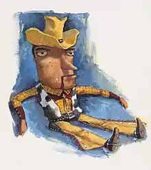 Woody was inspired by a Casper the Friendly Ghost doll that Lasseter had when he was a kid and the puppets from the children's television show Howdy Doody.[9][2] They based his facial features on Disney animator Tone Thyne.[10] Woody stayed a ventriloquist's dummy with a pull-string (hence the name Woody), until his character designer, Bud Luckey, suggested that Woody could be changed to a cowboy ventriloquist dummy.[11] Lasseter liked the difference between the western and the science fiction genres, so Woody was instantly changed. Eventually, all the ventriloquist dummy features of Woody were deleted as the dummy looked "sneaky and mean".[12] However, they kept the name Woody in homage to the Western actor Woody Strode.[13][14] In August 2009, Lee Unkrich, Toy Story 3 director, stated on his Twitter feed that Woody's last name is Pride and has been since earliest days of development.[15][16]