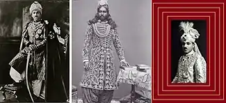 Achkan sherwani and churidar (lower body) worn by Arvind Singh Mewar and his kin during a Hindu wedding in Rajasthan, India.