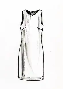 A shift dress is a dress in which the cloth falls straight from the shoulders and has darts around the bust. It frequently features a high scoop or boat neck.[3] Shift dresses are often confused with the sheath dress, which is form-fitting and shaped by tucks on the waist area. Shift dresses became popular in western fashion in the 1920s and were revived in the 1960s. They are most flattering on body types that are more like columns.[4][5]