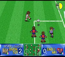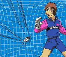 The football players are drawn in the "deformed" anime style. There's no different formations to choose from, but all the players (except the goalkeeper) can be positioned anywhere in the field. During a football match, an animated image will appear whenever a goal is scored. One of the particularities or flaws of this soccer game is that during the penalty shoot-out, the goalkeeper can move and jump before the rival player actually kicks the ball.