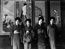 Shima Seien (third from left) with Okamoto Kōen, Kitani Chigusa, and Matsumoto Kayō in May 1916