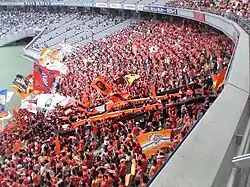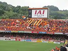 In common with other J.League teams, S-Pulse have a colourful and noisy collection of supporters who follow the team around the country. A supporter band is present at games home and away to help galvanise support and raise the decibel levels. The band models itself to a large degree after its Brazilian counterparts, and Latin rhythms and samba sounds predominate. For home games, S-Pulse's more vocal supporters gather in the second tier of The Kop; the stand behind the west goal at Nihondaira Stadium.[19] Also in this area can be found S-Pulse's various organised supporter groups. These groups include fan clubs dedicated to specific players and are often identifiable by unique uniforms. These fan clubs work to organise events which include mass choreographed displays and the supporter band.[20] Also housed in The Kop are S-Pulse's band of ultras, who each game take over a central area behind the goal which has been dubbed The Dragon Zone. Often physical, it is not uncommon for the area to descend into a mosh pit after important goals, and signs posted around the stand inform and caution general supporters of the area's lively nature. The club's official fan club has several branches around the country, and S-Pulse supporters are officially listed as the team's twelfth player.