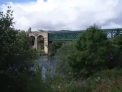 It crosses the river with a single 230 feet (70 m) span, 20 feet (6.1 m) longer than that used at the Dalguise Viaduct by Mitchell four years earlier.[1] The deck which carries the track sits on top of rather than between the truss girders.[1] There are two semicircular stone arches in the approach viaduct to the south, and three to the north.[2]