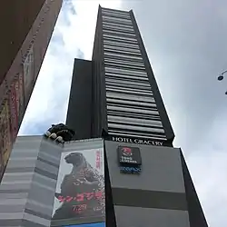 ![]() The building's exterior in 2016, with the Godzilla head statue visible on the building's terrace. | |