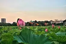 The Shinobazu Pond (不忍池, Shinobazu no Ike) is a pond within Ueno Park (a spacious public park located in the Ueno section of Taitō, Tokyo, Japan), and a historically prominent Shitamachi feature often appearing in history and works of art. The park occupies the site of the former Kan'ei-ji, a temple closely associated with the Tokugawa shōguns, who had built it to guard Edo Castle against the northeast, a direction believed to be unlucky by traditional geomancy. The temple was destroyed during the Boshin War. The pond, although modified many times and even once drained, is natural.