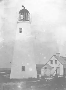 The first tower at this site was constructed in 1853; though appropriations were made starting in 1848; disputes over land ownership delayed acquisition of the land.[1][2] This tower was built of brick and was initially equipped with a multiple lamp and reflector system; three years later, it was upgraded to a fourth-order Fresnel lens.[2]