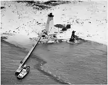 The wood tower stood until 1972, when it was accidentally set on fire from sparks from a campers' fire and burned down.[2] By that time Duvic had abandoned the tower, as Hurricane Camille had damaged it beyond repair.[2] The old range light from the Dan McColl years was replaced in 1971 by a much taller steel skeletal tower which still stands.