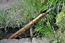 The temple's gardens are considered masterworks of Japanese gardens.[1] One of them includes a device called a sōzu, a type of shishi-odoshi designed to scare away wild animals such as deer by making a loud noise. Water trickles into a bamboo tube, and when it reaches a certain level, it upsets the balance of the tube. The tube tips over on a pivot, discharging the water, and turns upright, striking a rock and emitting a loud clapping noise. This link plays a recording of the sōzu at Shisen-dō.