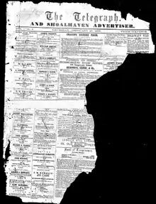 The Telegraph and Shoalhaven Advertiser was first published by Joseph Weston on 27 February 1879 in competition with the Shoalhaven News.[1] Weston installed his brother-in-law John Maclean as the newspaper's editor. The Telegraph's name was changed to The Shoalhaven Telegraph in 1881.[2] The Telegraph was sold to Maclean in 1886, who in turn sold it to Henry Rauch in 1900.[3] In 1937 the Telegraph was absorbed by the Shoalhaven News.[4]