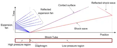 A simple shock tube is a tube, rectangular or circular in cross-section, usually constructed of metal, in which a gas at low pressure and a gas at high pressure are separated using some form of diaphragm. See, for instance, texts by Soloukhin, Gaydon and Hurle, and Bradley.[9][10][11] The diaphragm suddenly bursts open under predetermined conditions to produce a wave propagating through the low pressure section. The shock that eventually forms increases the temperature and pressure of the test gas and induces a flow in the direction of the shock wave. Observations can be made in the flow behind the incident front or take advantage of the longer testing times and vastly enhanced pressures and temperatures behind the reflected wave.