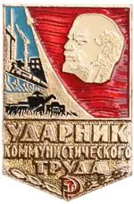 The Shock worker of Communist Labour (Russian: Ударник коммунистического труда, tr. Udarnik kommunisticheskogo truda) was an official title of honour awarded in the Soviet Union to those who displayed exemplary performance in labour discipline (udarniks). It was awarded with a badge and certificate, as well as a cash prize.