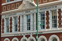 The Hoxton Street façade of the former Shoreditch workhouse. The site stretches to Kingsland Road, where many of the buildings remain as Saint Leonard's hospital.