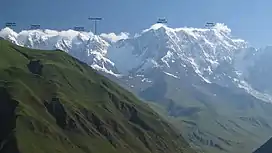 Shota Rustaveli (officially known as the Shota Rustaveli Peak) (Georgian: შოთა რუსთაველის მწვერვალი) is a mountain in the central part of the Greater Caucasus Mountain Range, straddling the border of Svaneti (Georgia) and Kabardino-Balkaria (Russia). The elevation of the mountain is 4,960 meters (16,270 feet).[2] Shota Rustaveli is generally considered to be the 9th highest peak of the Caucasus. The slopes of the mountain are glaciated and some of the glaciers descend well into the adjacent valleys. Its name comes from famous Georgian poet Shota Rustaveli.