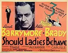 Should Ladies Behave is a 1933 American pre-Code comedy film directed by Harry Beaumont and written by Bella Spewack and Sam Spewack, adapted from the play, "The Vinegar Tree" by Paul Osborn. The film stars Lionel Barrymore, Alice Brady, Conway Tearle, Katharine Alexander and Mary Carlisle. The film was released on December 1, 1933, by Metro-Goldwyn-Mayer.[1][2]