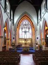 The cathedral has a number of outstanding stained-glass windows. The older set of windows are mostly from the stained glass company Hardman & Co. from Birmingham. The cathedral also has seven windows made during the second and third decades of the 20th century by an artist inspired by the Arts and Crafts movement, Margaret Agnes Rope, the daughter of a local doctor; Rope had a studio in the Glass House in Fulham from 1911 to 1923.[8] Later, Rope became a Carmelite nun at Woodbridge, Suffolk and later at Quidenham, Norfolk. She also designed and made a notable series of five large lancets at St Peter and Paul Church, Newport. Her cousin M. E. Aldrich Rope was also a stained-glass artist.[9]