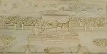The main temple of Shri Mahaverji is a vast & magnificent ornamented structure constructed using marble and red sandstone. The temple exterior plan follows Māru-Gurjara architecture.[11] The temple is built in Nagara architecture. The structure has oblong and canopied chhatris. Temple has multiple cusped arches that are supported by pillars and the spandrel is decorated with a fringe pattern.[12] The temple has three pinnacles each bearing golden kalasha.[5] This temple is surrounded by Dharmashalas.[13] The premises of Dharmashalas surrounding the temple is called Katla. In the centre of Katla, the main temple is situated.[14] The entrance gate of Katla is very attractive and magnificent.