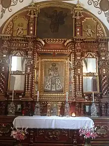 - Chapel del Santísimo. Miniature altarpiece, unique in the country, in an arabesque style with mirror altarpieces. In the central niche is the famous work of the "Pilgrim of Guápulo". His clothing is embroidered in silver thread, with the double-headed eagle shield and the Sanctuary of the Virgin of Guadalupe of Extremadura. It is a work of Spanish origin belonging to the 16th century. This altar is unique in its kind for its Chinese or Mudéjar, Baroque or Churigueresque originality.