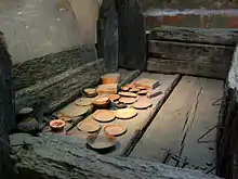 Robbers who looted the tomb in the late second century CE took the bamboo strips out of the lacquered bamboo hamper in which they had been placed and left the strips on the ground of the coffin chamber.[15] The chamber itself later collapsed, breaking the strips, and muddy water covered the strips, eventually turning them into "paper-thin sheets, fused together into clumps by ground pressure."[15] The largest of the three clumps was about 25 centimetres (9.8 in) long by 10 centimetres (3.9 in) wide and 10 centimetres (3.9 in) high.[5] To complicate matters, the 1977 excavation took place under a heavy rainstorm, and the pump that the excavators used to remove mud from the coffin chamber also pumped out other fragments of bamboo strips.[5]