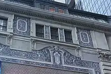 According to the New-York Tribune, the theaters' use of hand-carved sgraffito for decoration made Herts "the first man to have used sgraffito for this purpose".[27] The sgraffito was used because of New York City building codes that prevented decorations from projecting beyond their lot lines.[37][38][39] These decorations were colored light-gray, placed on a purple-gray background.[35][40] The sgraffito on the two theaters is one of the few such examples that remain in New York City. A contemporary source said the theaters' facades were "free from much of the gaudy trappings that has made some of the recent playhouses commonplace in appearance".[38]