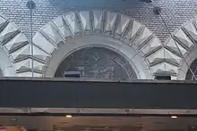 At ground level, the 44th Street elevation contains a tall water table of painted stone, above which is a band with rusticated blocks of terracotta. There are three arches at the center of the facade, which provide an emergency exit from the lobby.[7][36] Each archway originally contained a pair of paneled wooden double doors, but these have since been replaced with glass doors. On either side of the arches are rectangular sign boards topped by triangular pediments.[36] Within the archways above the doors are sgraffito paintings, which depict figures within aedicules.[37][38] These paintings are partially obscured by a modern marquee that is cantilevered from the wall above. The archways are surrounded by rusticated voissoirs.[36]