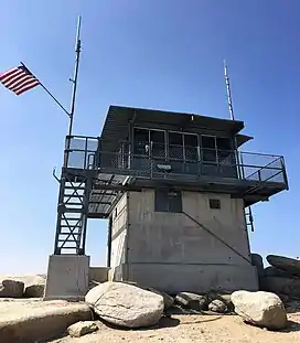 The current structure was built in 1957 featuring a 14' x 14' foot steel cab with a flat roof standing on a 10' x 10' foot concrete block base. A weather station was added in 2012.[9] Shuteye remains one of the few active lookouts in the Sierra Nevada. In 2017, Richard Bushnell, a seasonal U.S. Forest Service employee, was among the first to spot the Railroad Fire while stationed on Shuteye Peak.[10] The forest surrounding Shuteye Peak was threatened by the Creek Fire in September 2020.