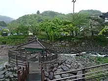 Tokko-no-yu is the best known hot spring in the system; it is located between the banks of the Katsura River in the middle of Shuzen town. A small rustic open-air public bath house has been built above the spring containing an ashiyu or foot spa.[2][5] Kawara-no-yu is a hot spring in the system that is used as a public foot bath; it is located at the riverside.[6] There are numerous commercial spa hotels and historic ryokan in the area, as well as Hakoyu, the public bathhouse.[7]