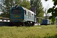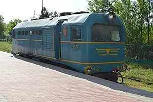 One TU2 diesel locomotive stems from the Alma-Ata Children's Railway, the other from the mine and smelter Atschpolimetall (Ачполиметалл) in Kentau. Two PW51 carriages of the Demichovsk factory are used for passenger transport. Some of the older Pafawag carriages are mothballed in Sportiwnaja railway station, some of them are used occasionally as back-up. The TU2-269 locomotive was decommissioned for spares. Even so, there is a significant lack of spare part. In summer 2003 the railway had to be closed temporarily twice due to maintenance issues of the locomotive.[2] 2010 it was in use, and even longer than in previous years, because it started operating in April.[2]
