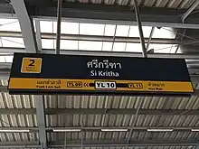 Si Kritha station (Thai: สถานีศรีกรีฑา) is a Bangkok MRT station on the Yellow Line. The station is located on Srinagarindra Road in Bang Kapi District, Bangkok and is a portmanteau of the name of Srinagarindra and Krungthep Kritha roads, of which intersect adjacent to the station.[1] The station has four entrances.[2] It opened on 12 June 2023 as part of trial operations on the line between Hua Mak and Phawana.[3][4]