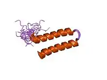 The N terminal domain is a dimer. Each monomer has an alpha helical hairpin in which the two alpha helices are connected by a tight 3-residue turn. Hairpins from two monomers associate as a four-helix bundle.[2]