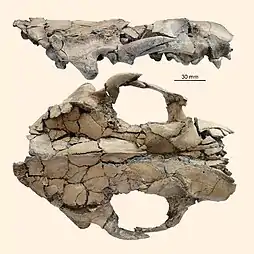The skull reveals a combination of otter-like and badger-like cranial and dental characteristics. The new species belongs to the Lutrinae because of its possession of a large infraorbital canal and ventral expansion of the mastoid process, among other traits.[2] Siamogale melilutra was about 1.9 m (6.25 ft) in overall length and weighed at least 40 kg (88 pounds).[3] The remains of the skull were found in China and were re-created with a special program called the CT scan which is able to reconstruct the skeleton without being damaged.