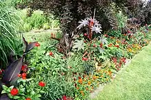 Contrasting or harmonious patterns are formed by combining different colors, textures, structures, and growth forms of foliage and flowers.[3] Kingsbury finds the color scheme to be inspired by the designs of Gertrude Jekyll.[1] The combinations range from complementary, such as orange Tropaeolum and purple Buddleia cultivars, to more analogous, such as orange Lilium and yellow Kniphofia, Eremurus, and Euphorbia cultivars set against grey-blue grasses and Nepeta planting.[6] The Sichtungsgarten primarily displays combinations of colors and textures typical of various habitats, evoking the founder's belief in designing plant communities,[1] but artistic compositions can also be found, including the 'Red Border', which contains only plants with flowers in the various shades of red.[7]