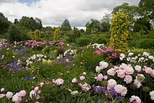 The Sichtungsgarten contains a large collection of Paeonia and Hemerocallis species and cultivars,[6] as well as other plants which require high maintenance when used in mass plantings, such as those in the Delphinium and Lilium genera.[1] Hansen included these out of recognition of their historical and sentimental value.[1] The first paeonies were planted in the 1950s, and some have surpassed the age of 60.[7] According to Kingsbury, however, the garden's aim is to direct the visitors' attention to plants that thrive in public space with minimal care, such as ornamental grasses, Leucanthemum species, and xerophilic Salvia species. Dwarf Aster dumosus cultivars, used for filling in gaps and smothering weeds, are some of the prominent subjects that used to be more popular garden plants in the past.[1]