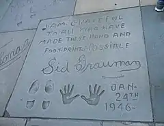 - ↑ "Sid Grauman Dies. Theatre Owner, 70. 'Immortalized' Movie Stars by Recording Hand and Footprints in Wet Concrete". New York Times. March 6, 1950. Retrieved 2007-08-21.