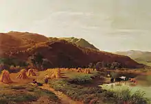Sidney Richard Percy had his greatest success painting landscapes of grazing cattle, typically set against backgrounds of distant mountains and cloudy skies. The prevailing hues of his landscapes are earth tones and soft greens, accentuated by a variety of pastel hues. The detail in his work is part of its appeal, and "it was remarked that his rocks and stones were sufficiently accurate to have served as illustrations to the writings of Sir Roderick Murchison, the popular 19th-century geologist."[9] Llyn-y-Ddinas, North Wales, one of his more popular works on the internet, displays these qualities. He also painted landscapes of farm fields, wheel-rutted country roads, and the occasional boat scene on a lake.