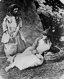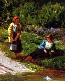 His art interests were not limited to painting, and he was also an amateur photographer, in a day when photography was new and exciting, yet still a poorly understood medium. He frequently used his own photographs of gypsies in the Barnes or Wimbledon Common as the basis for similar figures in his paintings, even though some contemporary critics complained how these figures ruined what otherwise would be delightful landscapes. A classic example is Storm Gathering on Cader Idris, North Wales, which he exhibited in 1856 at the Royal Academy, and which has the same gypsy girls in it as one of seven of his photographs in the Victoria and Albert Museum.[9] In fact, this painting is one of the ones singled out for some of the aforementioned criticism. These same girls appear in his 1861 work A Rest on the Roadside, and they appear again, but reversed, in his 1873 version of Llyn-y-Ddinas, North Wales, showing that he repeated themes when convenient.
