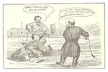 Caricature showing Shippard (bald with beard) and R.W. "Limner" Murray tripping up the Lieutenant Governor of Griqualand West, Major William Owen Lanyon