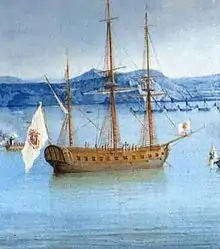 In the meantime, Longobardi was taken again, many chieftains died in its defense, and the captured President De Micheli himself managed to take shelter in Fiumefreddo;[11] a British frigate, commanded by Admiral William Sidney Smith's nephew, appeared on the coast of Amantea on January 27, bringing reinforcements for the Amanteans. The besieged succeeded in sending a messenger to the ship, a certain Giuseppe Francesco Secreti known as "Gal Gal," who then remained on board the ship to present himself to the sovereigns in Palermo on behalf of the Amanteans.[11] Another frigate and two Bourbon corvettes came to the frigate's rescue on January 29, however, the landing attempt failed under the shots of the French artillery.[12]