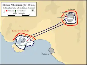 The siege of Athens and Piraeus was a siege of the First Mithridatic War that took place from Autumn of 87 BC to the Spring and Summer of 86 BC.[5] The battle was fought between the forces of the Roman Republic, commanded by Lucius Cornelius Sulla Felix on the one hand, and the forces of the Kingdom of Pontus and the Athenian City-State on the other. The Greek Pontian forces were commanded by Aristion and Archelaus.[6]