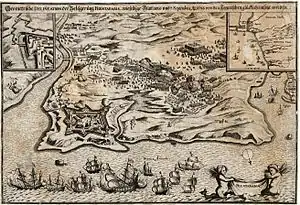 The French army commanded by Henri de Bourbon, Prince of Condé, Bernard de La Valette, Duke d'Épernon and Henri d'Escoubleau de Sourdis[3] composed of 27,000 men and several warships besieged the city for two months, firing 16,000 shells into the walled city, leaving only 300 survivors, most of them women and children. The city was virtually destroyed, but nevertheless did not surrender.