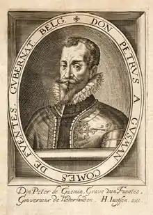 While some in the Anglo-Dutch camp were expecting a long siege, the vast majority were expecting a short fight, in the belief that the city wanted to become part of the Republic.[15] The Groningen elite however had firmly said no to negotiate a treaty with Maurice as they had counted on a relief by troops from the Governor Ernst of Austria. He ordered Pedro, Count of Fuentes, to relieve the city and ordered the garrison not to enter into any negotiations on pain of death. In the meantime with this potential news the Spanish garrison fired furiously hoping to weaken the besiegers defences but it only managed to churn up the ground.[17] Fuentes struggled to bring together his army of less than 5,000 men however because of mutiny in its ranks as well as Dutch cavalry harassing on its march. Eventually with disease, desertion, and casualties – the attempted relief was abandoned.[18]