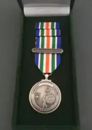 The Jadotville Medal (Irish: An Bonn Jadotville), is a campaign medal which can only be issued to the members of "A" Company, 35th Infantry Battalion who fought during the Siege of Jadotville in 1961. "A" Company, under the command of Commandant Pat Quinlan, was part of the Irish Army forces participating in the United Nations peacekeeping operations in Congo.[1] The medal depicts a Celtic warrior and the shoulder badge that was worn by all Irish UN soldiers in the Congo.[2] Also depicted on the medal are the words Cosaint Chalma (Valiant Defence) and Misneach (Courage).[3]