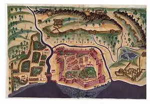 Fearful that his ships might be caught off-guard by a Portuguese fleet if he left it anchored out on the open sea, Lassemane decided harbour it within the Duyon River one league to southeast of Malacca.[18] Seven Acehnese galleys remained outside to intercept any passing merchant vessels carrying provisions to Malacca, but this course of action was ineffective: captain-general António Pinto da Fonseca had vessels stationed at Pulo Butum and the Strait of Singapore to warn any incoming vessels of the presence of the Acehnese fleet, while at night captain-major Francisco Lopes ran the blockade with light boats, and escorted the merchant vessels into the city, eluding Acehnese patrols, hence throughout the duration of the siege Malacca remained supplied.[19]