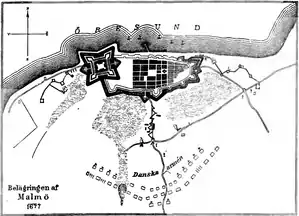 The siege of Malmö (Swedish: Belägringen av Malmö) was an unsuccessful Danish siege on the Swedish-held city of Malmö, fought between June 11 and July 5, 1677. Fought towards the end of the Scanian War, the siege was one in a string of Danish losses that saw Swedish forces under King Charles XI of Sweden establish control over the southern region of Sweden.