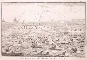In early 1769, the 'Alawite Sultan Mohammed ben Abdallah, refusing to acknowledge the Portuguese rule in Mazagan,[6] prepared a large army of 70,000 men, arriving at Mazagan during the month of Ramadan, he had 35 cannons prepared and bombard it with 2,000 round shots into the city inflicting heavy casualties on the Portuguese and Damaging the city, as the siege prolonged, the garrison sent a letter to King Joseph I of Portugal asking for aid, Joseph instructed them to evacuate the fort taking everyone alongside their families when the inhabitants knew this they refused to abandon their last colony arguing their ancestors sacrificed themselves to keep it.[7] Later the inhabitants complied to the order and sent to Sultan Mohammed asking to stop the fighting and give them 3 days to evacuate the town, Mohammed accepted on condition that they would leave everything behind.[8]