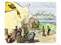 The remainder of the Russians took up positions on both sides of the River Neva by 7 October, and during the next several days they were busy constructing artillery batteries,[10] which were completed by 12 October. The difficult job of securing the outwork on the Neva's bank was handed over to the Preobrazhensky Regiment, which, at four o'clock in the morning of 12 October, embarked towards the far coast of the river. Under the leadership of the Czar himself, the Russians were successful in capturing the sconce, encountering little resistance. Upon its capture, further construction work began, and eventually the town was besieged from all sides.[4] Using a fleet of small boats, which they brought down from the river Svir through Lake Ladoga, the Russians succeeded in completely blockading the fort. They then sent a letter to the Swedish commandant, Wilhelm von Schlippenbach, requiring that he surrender the fort. Schlippenbach requested a four-day wait to allow him to consult with General Arvid Horn, his superior, who was in Narva;[4] however Russian forces opened fire on the same day.[3]