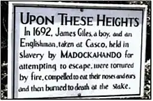 - ↑ In Castine, Maine, a plaque on Dyce Head Lighthouse Rd. says: UPON THESE HEIGHTS, in 1692, James Giles [brother of John Gyles], a boy, and an Englishman, taken at Casco [initially taken in the Siege of Pemaquid (1689)], held in slavery by Madockawando for attempting to escape, were tortured by fire, compelled to eat their noses and ears and then burned to death at the stake" (See John Gyles' captivity narrative, p. 10-11).
