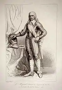 Johann von Nassau-Siegen, meanwhile, found some French troops and began to withdraw in disorder.[40] La Force immediately sent his cavalry and some musketeers under Comte d'Arpajoux to harass the rear-guard of the Count.[31] The Spanish cavalry was in danger of being disbanded for a moment, but a sleeve of musketeers under Captain Don Antonio Pimentel, hidden in some hedges, managed to hold back the attack giving time to the Count to withdraw his troops.[41] Pimentel was badly wounded in an arm, but he and his men managed to retreat because Arpajoux did not want to waste time finishing them and advanced towards Fort St. Jean.[42] The retreat of the Count was soon noticed by Saavedra. Fearing that the relief force arrived on time, the Maestro de Campo sent his aid to ask Thomas of Carignano for permission to assault the fort, which was given.[43]