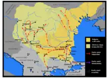 The Byzantine Empire, however, was the first to initiate conflict. In 807, the Byzantine emperor Nikephoros I marched against Bulgaria but was soon forced to return to Constantinople due to a mutiny of his troops at Adrianople.[1] The following year, the Bulgarians, in response to an equestrian raid in the valley of the Struma River, defeated the Byzantines and captured their baggage.