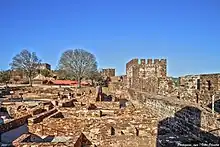 As a place of strategic significance, the fortifications of Silves were extensive, but perhaps not "fully developed" in 1189. They had been sufficient to require siege engines during the siege of 1063.[8] The Almohads had made repairs after taking full control in 1157.[14] The hilltop was surrounded by a rampart of rammed earth faced with stone. It had at least seventeen towers of the albarrana type, that is, set outside the wall and connected to it by means of elevated walkways. The tower below the main gate was especially large. They were not hollow structures but rather elevated fighting platforms, solid to a height equal with the walls. Two parallel walls led down from the hilltop to the river, protecting the water supply, which was also protected by four towers.[15] The author of the Narratio calls the walled section leading to the river a corrasce, from the local Romance word couraça, "breastwork".[16][17] The suburb at the base of the hill had a weaker system of walls and was protected by a single tower. The fortifications are described in detail by al-Idrīsī.[15]